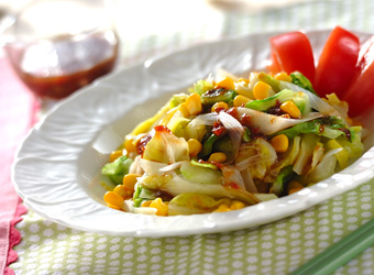 キャベツは大きめにザク切りにし、サッとお湯に通すことで、野菜本来の甘みを引きだし少量のドレッシングでおいしくいただけます。