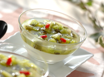 ③バットなどに流し入れた場合は、食べやすい大きさに切り、<キウイシロップ>を注ぎ入れ、クコの実を飾る。