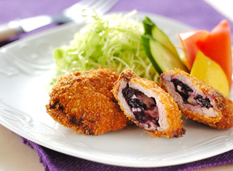 目の疲れを防ぐのに効果があるといわれているビタミンBを多く含む豚肉に、ブルーベリーコンフィチュールとタンパク質を含むチーズをサンドし、フライにしました。