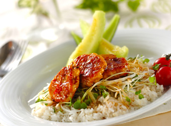 ④器に雑穀米をよそって合わせた大根をのせ、③の<チキンバーグ>とプチトマトを盛り、<甘辛ダレ>をかけ、メロンを添える。