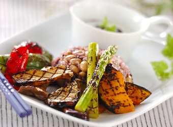 黒米と水煮大豆を加えたパープルカラーのご飯に、網焼きにした夏に元気な野菜を盛りつければ、見た目のおいしさもプラス。