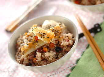 根野菜と黒米が入った雑穀の炊き込みご飯。