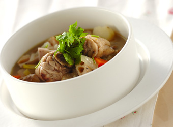 「フィトケミカル」を含む根野菜のレンコン、ジャガイモ、玉ネギ、ニンジン、ゴボウと、「コラーゲン」たっぷりの骨付き鶏肉を使ったおいしいスープ煮。もちもち肌づくりにぴったりなスープです。