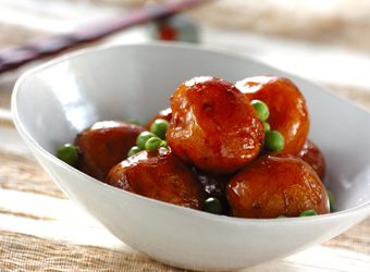 小粒で皮が薄くやわらかい「新じゃが」を、まるごと揚げ、シンプルに和風味で煮含めた、煮っころがし。